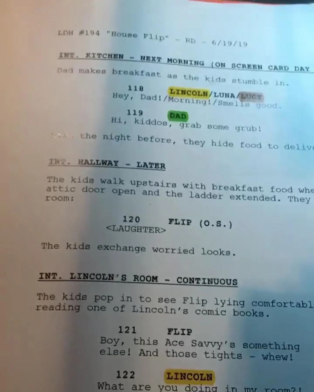 On the final day, Lynn Sr. needs to use the bathroom, but discovers someone is already using it. To make matters worse, he discovers that none of the kids are using it. As the kids desperately try to fool Lynn Sr. into thinking one of them is in there, Flip suddenly opens the door. Realizing they've been exposed, the kids admit to having got into another accident in Vanzilla and it resulted in Flip getting injured, so they opted to take care of him without them knowing, saying it was the right thing to do. As a result, Rita and Lynn Sr., upset that their children not only got into another accident, but also have been lying to them about it, take away their driving privileges indefinitely. However, Flip tells them to go easy on them, since they did take care of him. Realizing they went overboard, the parents decide to cut back on the discipline and revokes their driving privileges for the rest of the month. As a thanks for helping him get better, Flip decides to give the kids free Flippees once their ban is lifted. The next day, Rita and Lynn Sr. drop off a fully recovered Flip at his store. Suddenly, when Lynn Sr. jams to a cowbell song on the radio, he accidentally bumps the gear stick into reverse, causing a domino effect that results in the roof of the building landing right on top of Flip, crushing him again. With his injuries back, Flip is now being catered by Rita and Lynn Sr., effectively putting them through the same struggle their own kids had to endure. Cast[]