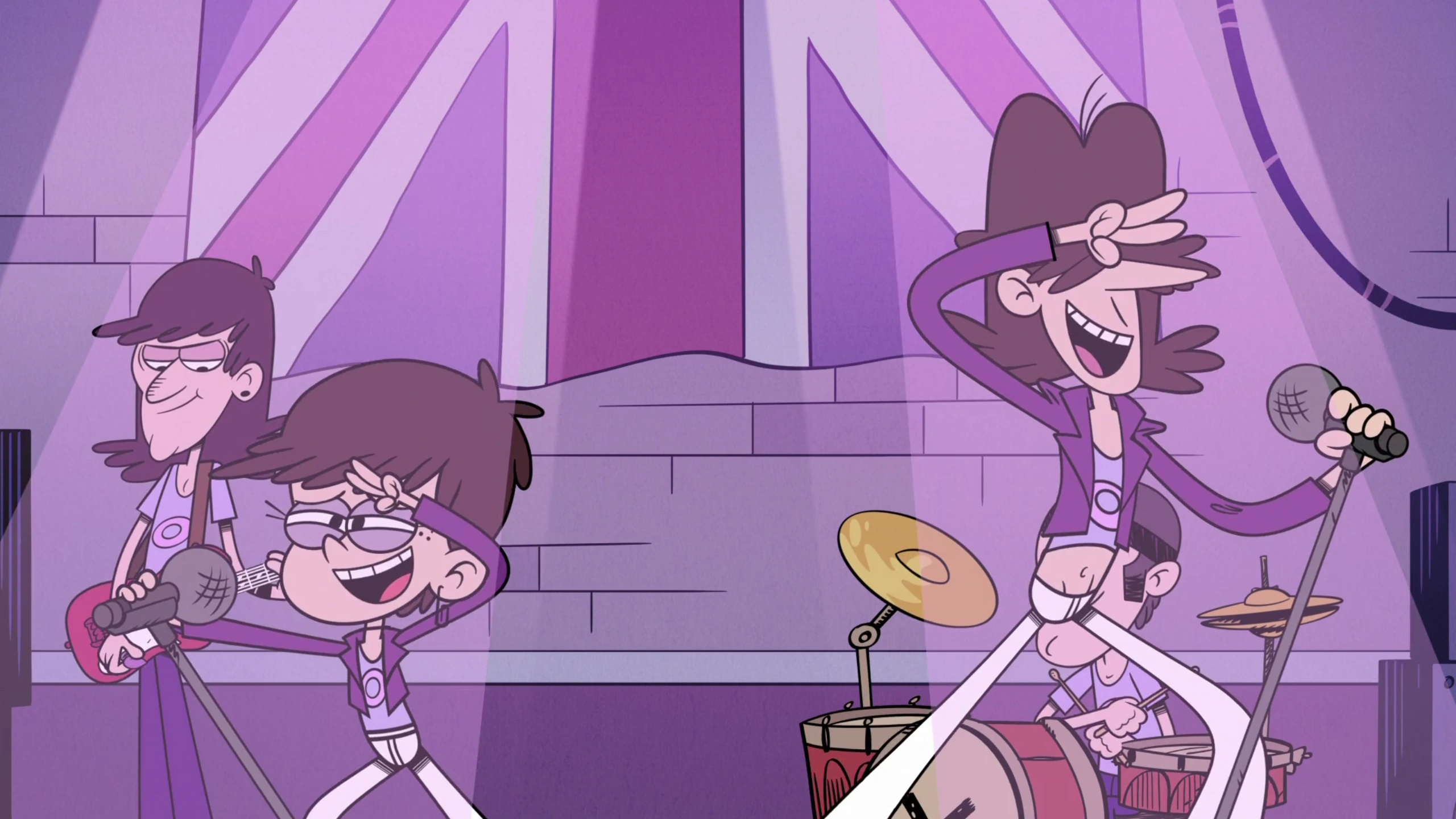 "In the Mick of Time" is the thirty-seventh episode (thirty-eighth in production order) of the fifth season, and the two-hundred-thirty-sixth episode of The Loud House. Plot[]After embellishing her friendship with Mick Swagger, Luna must try to convince the star to perform at her high-school dance. Synopsis[] The Moon Goats ask Luna to get Mick Swagger to perform for their dance. At Royal Woods High, Luna is telling Sam, Sully and Mazzy stories of her interactions with Mick Swagger, like how her first concert changed her life for the better and how she met him while in disguise at a restaurant. After telling her stories, Luna expresses excitement that she'll be seeing him perform at his concert tonight. Suddenly, Leni arrives. She explains that the band hired to perform for the school's "Cut a Rug Dance" dropped out at the last minute. As the head of the dance committee, Leni asks if the Moon Goats can perform, but Sully and Mazzy state that they can't perform, as they sprained their wrists after slipping on some puddles. When Luna gets ready to leave so she can get to Mick's concert, Sam suddenly gets the idea that Luna should invite Mick to perform at the dance, and is practically begged by her friends and Leni to get him, since they believe the two share a close bond. At night, Luna and Chunk watch Mick perform at the Royal Woods Mall. Chunk notices that Luna is in distress, and Luna explains that her friends want her to get Mick to perform at their high school, but is worried that Mick won't remember her. This prompts Luna and Chunk to try and get Mick's attention, from flailing her arms, shining a flashlight at him or crowd surfing towards the stage, but all those efforts end up fruitless. Suddenly, Luna gets the idea of slipping him a note backstage. Chunk says that getting backstage requires a VIP pass, but he knows a way to sneak in. Sneaking in backstage, Luna and Chunk pose as pizza delivery guys, and tell the bouncer that they got a pizza for Mick Swagger, which secretly has a note inside asking Mick to perform for the high school dance. After handing the pizza, the concert ends. Later, as Mick's band has finished eating the pizza, Luna and Chunk sneak back in to see if he read the note. Pulling the pizza box from the garbage can, Luna discovers the note stuck to the box by a slice of pizza, making Luna believe Mick didn't see the note. This causes Luna to become worried on how she's going to relay the bad news to her friends. The next day, Luna is about to tell her friends the bad news that she couldn't get Mick to perform, but before she could tell them, they escort her to the gymnasium, revealing that the theme of the party is entirely dedicated to Mick Swagger. This is especially bad for Luna, as word about this change is known all over the high school, and everyone now believes that Mick will be performing. Later, Luna is stuck on what to do now, since everyone now believes in a lie. After giving a sarcastic speech with a Mick Swagger impression, Luna realizes that she could pose as Mick herself. At nighttime, the school dance is about to begin. When Principal Rivers asks where Mick is, Luna says that he's backstage, and only close companions are allowed to see him. Excusing herself backstage, she quickly puts on Mick's outfit and mullet, and Chunk says that while he plays Mick's song on his laptop, Luna has to simply lip sync. With everything set up, Principal Rivers introduces "Mick Swagger", and Luna starts performing. Luna attempts to juggle between performing as Mick while also trying to accompany Sam, with Chunk stopping and restarting the music with each exchange. However, while getting ready to perform as Mick again, Luna accidentally tosses a cup of punch onto Chunk's laptop, causing the laptop to go haywire and play Mick's song at rapid speed. Luna, keeping up with the fast tempo, accidentally falls over when her guitar starts smoking from the rapid strumming, pulling the curtain down and revealing Chunk. Freeing herself from the tangled curtain, Luna's mullet falls off, revealing her charade in front of all the high schoolers. When Sam and Rivers approach her and ask what's going on, Luna confesses that she pretended to be Mick because she couldn't get him to perform for the dance, and believes that he doesn't know her. Suddenly, Mick arrives and tells Luna that he did read her note from the pizza box. He also explains that the reason why he and his band were so late was because Luna never specified which high school she went to, prompting them to visit every high school in the county. Now that he's present, Mick suggests that he and Luna perform as a duo, since they're wearing matching outfits. Mick Swagger and Luna perform for the whole school together. Moments later, the party ends up becoming a smashing success thanks to the combined performances of Luna and Mick. Cast[]