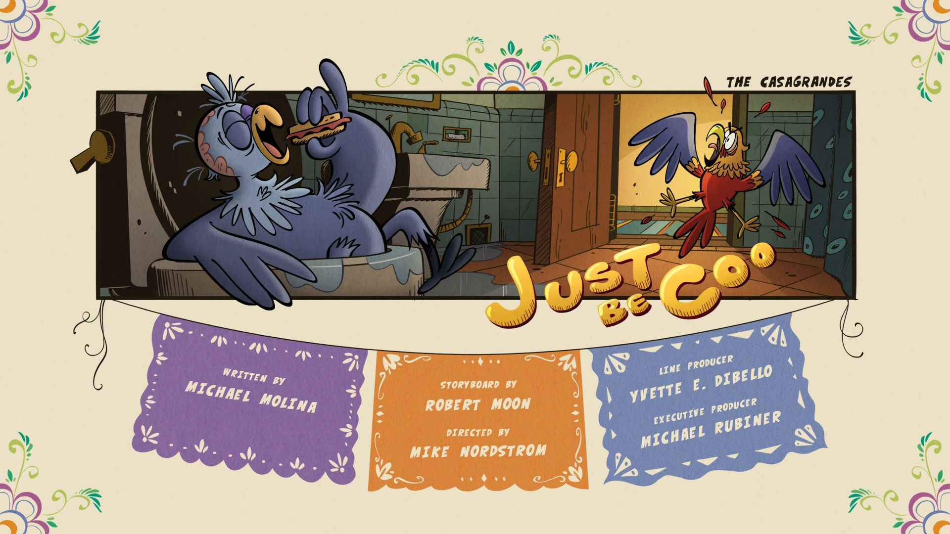 "Just Be Coo" is the twenty-seventh episode of the second season, and the sixty-fifth episode of The Casagrandes. Plot[]When Sancho gets himself into trouble in the city, Sergio helps him become a model pet. Synopsis[]At nighttime, Sergio goes to a party at the park being hosted by Sancho. At the park, Sergio, Sancho and all the other pigeons party throughout the night. The next day, as Sergio sleeps, he is woken up by Sancho pounding on the window. Sancho tells Sergio that he's being sought after, as he shows a video what's happening. In the video, Jim Sparkletooth reports that sometime last night, a statue in the park got vandalized by being covered in bird droppings, and the animal wrangler, Marcus, intends on capturing the birds who did the heinous act, including their "ringleader", Sancho. Sancho insists he's innocent, and asks Sergio if he can crash at the apartment for the time being, and Sergio agrees, since he's a friend, but only on the condition that he keep his presence a secret. Unfortunately, not long afterwards, Sancho becomes a hassle for Sergio to watch over. First, while trying to get a wagon full of food for Sancho, Hector arrives and tells Sergio that all the food on the wagon better be eaten or else he'll be accused of wasting money. Seeing Sancho wander in the kitchen to eat garbage, Sergio proceeds to stall Hector by eating everything on the wagon, resulting in him becoming fat. The moment Hector leaves, Sergio captures Sancho and drags him back to Ronnie Anne's room, but leaves after just a few seconds. Entering the bathroom, Sergio spots Sancho having a bath in the toilet. At that moment, Rosa enters and discovers Sergio using the toilet, prompting her to excuse herself. After a brief scuffle that results in Sancho flushing the feathers off Sergio's bottom half, the two leave the bathroom and head back to Ronnie Anne's room, but Sergio discovers that Sancho has gone missing again. Entering the living room, he discovers Sancho secretly leeching off the food and drinks Ronnie Anne, Bobby and Maria are eating while watching a soccer game. In an attempt to get Sancho away from them, he bites into the TV cable, shorting the TV out and prompting the three Santiagos to rush over to the other apartment. Sancho tries to follow, but Sergio, having had enough of him disobeying his orders, drags him to Ronnie Anne's room and tells him he's kicking him out, believing he really did vandalize the statue. Just before being kicked out, Sergio makes Sancho wear a hat, believing that'll be unrecognizable. With Sancho finally off his back, Sergio decides to relax by watching TV, but the first thing that comes up is a news report where Jim Sparkletooth reports that Marcus has captured Sancho. With his interest in TV gone, Sergio suggests to Lalo that go outside to spend their day. However, each location they go causes Sergio to remember his memories with Sancho, like his bird nest where the two would wake up after parties, an alley full of garbage where they would eat and a TV showcasing their favorite show. Now filled with guilt for getting his friend in trouble, Sergio proclaims that they must rescue him. Arriving to the animal pound, Sergio and Lalo need to figure out how to get inside. Seeing Vito walk his dogs, Sergio decides to toss his pizza onto Vito's head, where Big Tony and Little Sal immediately jump on him to eat the pizza. As Marcus attempts to deal with the situation, Sergio and Lalo enter the pound. As Lalo searches for the keys, Sergio discovers containers of pistachio flavored ice cream in the garbage can, and realizes that it has the exact same color scheme as bird droppings. This causes Sergio to realize that the pigeons were framed. Suddenly, Marcus approaches from behind them and captures them, where he immediately has them locked up. Needing a way to fight against this act in injustice, Sergio asks Marcus for a phone call. Sergio calls up Ronnie Anne and tells her to come to the pound with her laptop. Later, Ronnie Anne is at the pound reasoning with Marcus on letting her pets go. When Marcus tells her that they have to serve time since they were breaking and entering the pound, Sergio asks for Ronnie Anne's laptop. He quickly brings up security footage of the park entrance, which reveals Marcus sneakily covering the statue with pistachio ice cream. Realizing the pigeons were framed (and her pets being arrested for learning the truth), Ronnie Anne threatens to reveal this footage to Jim Sparkletooth unless Marcus releases everyone now. Marcus ultimately cracks and admits that he framed the birds, saying that he never gets invited to their parties, and thought arresting them would prevent them from having any more parties. He further explains that the reason why he wants to join their party is because his animal wrangling duties is just his day job, and has a life outside of it. Marcus proceeds to free everyone, and Sergio, taking pity on Marcus, makes a promise to him. That night, the pigeons have another party, and have let Marcus and Ronnie Anne join them. As everyone parties, Sergio apologizes to Sancho for kicking him out, and admits that Sancho is the way he is because he's just a party animal. Cast[]