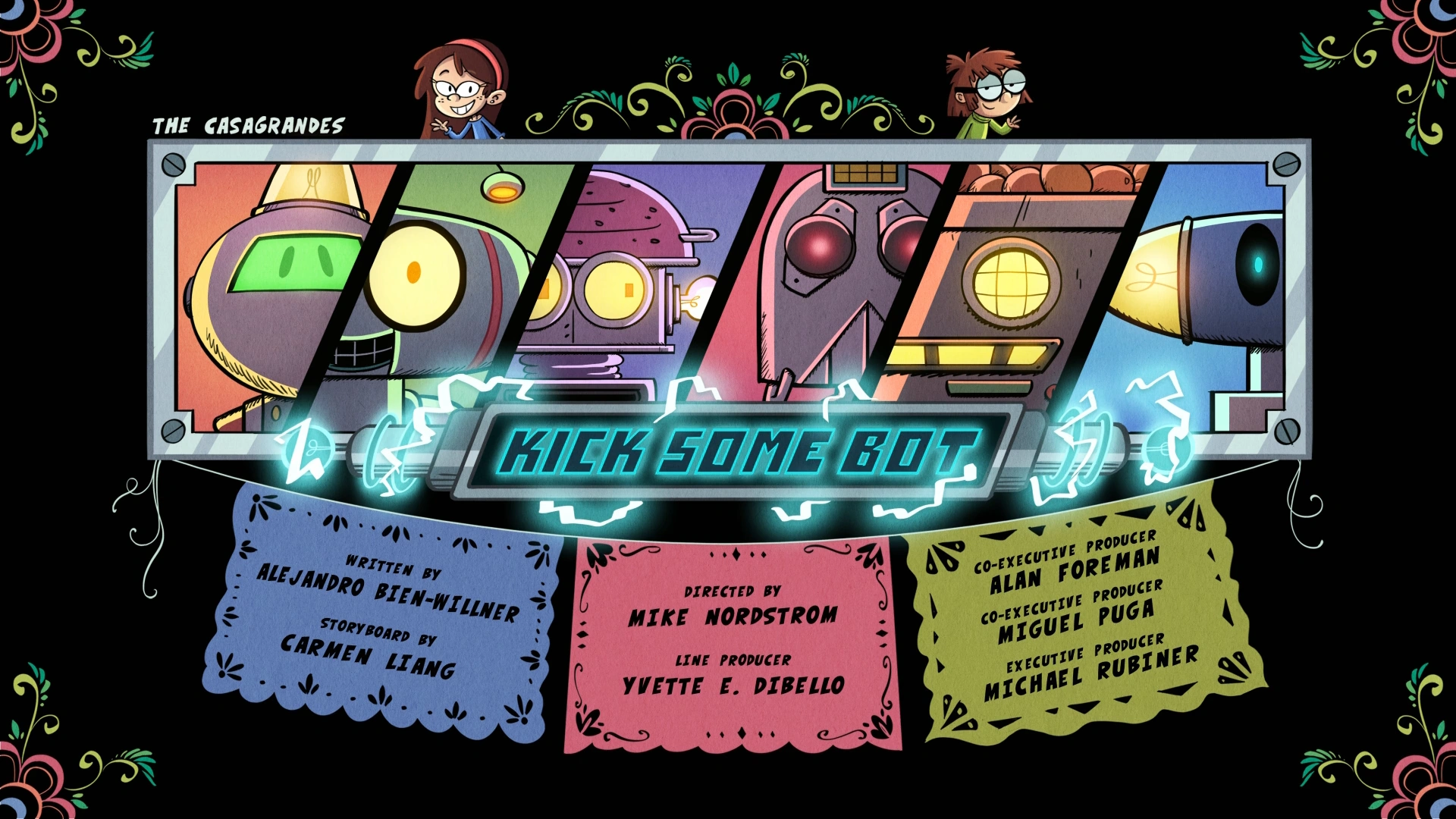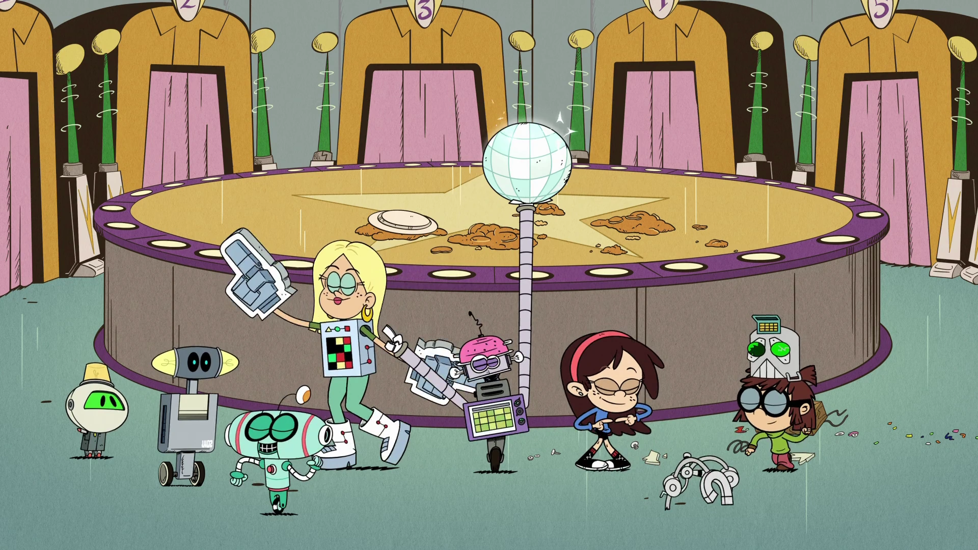 "Kick Some Bot" is the twenty-seventh episode of the third season, and the one-hundred-second episode of The Casagrandes. Plot[]Sid faces off against Lisa Loud in the Great Lakes City robotics competition! Synopsis[]In the Chang apartment, Adelaide tells her mom that she won a first-place ribbon for her unicorn princess outfit in a cosplay contest. Becca congratulates Adelaide and proceeds to place the ribbon on a shelf filled with lots of trophies and awards for Adelaide. Sid, feeling left out, tries to impress her mom by saying that she managed to eat a slice of pizza in one bite, but before Becca can respond, she gets a call from the zoo and leaves, having to deal with an emergency. Later, in Ronnie Anne's room, Sid is telling Ronnie Anne that her mom gives Adelaide all the attention. When Sid questions how she could impress her mom, Ronnie Anne learns that there's a robotics competition coming to Great Lakes City, and Sid decides to join, given her love of robotics. Sid and Lisa Loud enter the Great Lakes City robotics competition. On the day of the competition, Sid and Becca arrive. As Becca goes to her seat, Sid looks around to see her other competitors, but just when she thinks she could win, a very familiar voice clears her throat: it's revealed to be Lisa Loud, who has decided to join the competition with her robot, Todd. The competition starts, and all the robots have to do various challenges.