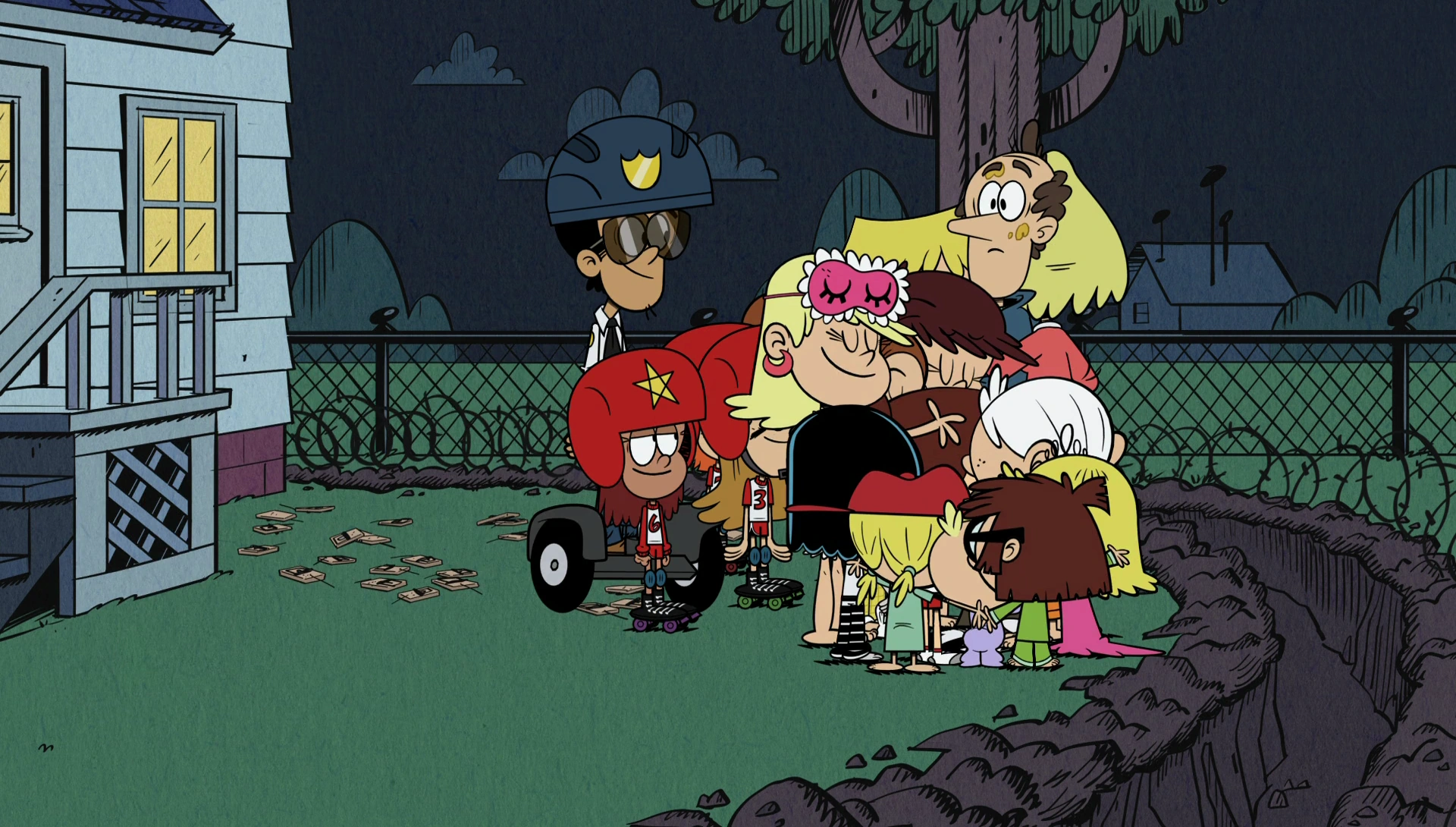 "Lock 'n' Loud" is the twelfth episode of the second season and the sixty-fourth episode of The Loud House. Plot[]When Dad becomes upset with the children for never locking the front door, they decide to take home security to the next level. Synopsis[]Late at night, Rita and Lynn Sr. arrive back home after taking ballroom dance classes. After Lynn Sr. inadvertently twirls Rita into a rose bush, he heads into the house to get a first aid kit, but to his frustration, he opens the door without having to unlock it. He enters the house, and scolds the relaxing kids for not locking the door at night, reminding them that there have been some burglaries recently, and fears that their house might be next. Lynn Sr. locks the door, the kids go back to relaxing, and Rita is still trapped in the rose bush. After finding out a robber's on the loose, the kids decide to defend their house. In Lori and Leni's room, Lincoln admits to his sisters that their dad's right and that they need to be more responsible if they don't want their house to get robbed. Fearing on losing their possessions, as well as Lincoln stating that just locking the front door isn't enough if they want to protect their stuff, they decide to lock down the whole place, which the sisters cheer to. Lynn Sr. scolding the children on not locking the door. Clyde arrives at the Loud House, but before he can walk onto the porch, Bobby, on a Segway while wearing his mall police attire, approaches Clyde and asks him for his name and business. When Clyde asks Bobby what he's doing, the latter informs that due to new security measures by Lori, he was hired to guard the house. Lori decides to vouch for Clyde, and he's allowed access into the house. The moment he steps in, he falls victim to two of Lisa's alarm systems, and flees before she unleashes a third one (an alligator pit). Clyde enters Lincoln's room, ready for the job, which involves the two listening to a police scanner. Later, when Lincoln exits his room, he sees his sisters stashing their closest possessions in the bathroom, since Lisa has a security camera installed in there. At the same time, Lynn is teaching Leni and Lola how to attack a burglar (which Leni fails at, since she finds the practice dummy cute, while Lola viciously attacks it). Walking into the kitchen, Lincoln sees Lana trying to teach Charles to be a vicious guard dog. However, Charles is too lazy to do Lana's commands. Later that night, Rita and Lynn Sr. are about head off to dance class again, and Lynn Sr. lauds the kids on being more mindful toward security. Sometime later, as Lincoln and Clyde are sleeping, the scanner goes off and reports a 10–15. Checking the codebook, Lincoln discovers that the burglar has been caught, to which everyone cheers to. At that Rita and Lynn Sr. arrive back home. After Lynn Sr. once again twirls Rita into another predicament, he prepares to enter the house, only to once again, finding it unlocked. As the kids take back all of their possessions, Lynn Sr. once again scolds them for not locking the front door. When Lincoln informs him that the burglar has been caught, Lynn Sr. points out that there could be more burglars out there, but the kids pay little heed. Frustrated that nobody's listening to him, Lynn Sr. locks the door himself, once again forgetting to help out Rita. The next night, Rita and Lynn Sr. once again leave for dance class, but the instant they leave, Mr. Grouse yells out that he has been robbed. When the Loud kids check up on Mr. Grouse, he informs that that several of his closest possessions have been stolen. Fearing that the (other) burglars could attack their house next, the kids decide to take their security to the next level. After stashing their possessions in the bathroom again, the kids prepare to do some improvements, which include Lincoln and Clyde filling a vat with bacon grease, Lola operating a searchlight, Luna, Lucy and Lily digging a ditch surrounded with barbed wire, Luan setting up numerous mousetraps, and Lynn recruiting her roller derby teammates to work alongside Bobby. When Rita and Lynn Sr. arrive back home, they're shocked at how far the kids are taking this. While Lynn Sr. admits that he appreciates that the kids are taking security more seriously, he feels they've taken it too far, and orders them go to bed. Later that night, a shadowy figure comes out of the Loud House and approaches Mr. Grouse's house. The shadowy figure is revealed to be Lynn Sr., who had Mr. Grouse pretend that he was robbed so he can teach the kids a lesson. After paying Mr. Grouse with a basket of muffins, Lynn Sr. prepares to head back into the house via the kitchen door, but gets locked out by Leni, who was in the kitchen at the time. Realizing this, Lynn Sr. tries to climb through the kitchen window, but it turns out to be locked too. When Lynn Sr. falls over (due to standing on a tricycle), his noisiness catches Lincoln's attention. He peeks through his window, and witnesses a shadowy figure below. Thinking it's a burglar, Lincoln pulls on a string that rings a bell in everyone's bedroom, waking them up and telling them to take action. As Lynn Sr. tries to find another way in, he falls victim to the kids various traps, such as Luan's mousetraps, Lincoln and Clyde's vat of grease, the ditch that Luna, Lucy and Lily dug and Lynn's roller derby teammates pummeling him. The family forgiving Lynn Sr. Rita orders the teammates to stop attacking the intruder, since she recognizes Lynn Sr.'s dance shoes. Lynn Sr. lies by saying that he was out for a walk, and he got locked out. As everyone apologizes to him for attacking him, Mr. Grouse, with his face incredibly swollen, complains that the muffins Lynn Sr. gave him have walnuts (which Mr. Grouse is allergic to), and warns him that if he ever wants to pay him for pretending to be robbed, he should give him something he's not allergic to. With the truth spilled, Lynn Sr's family scolds him for lying to them while Lily glar