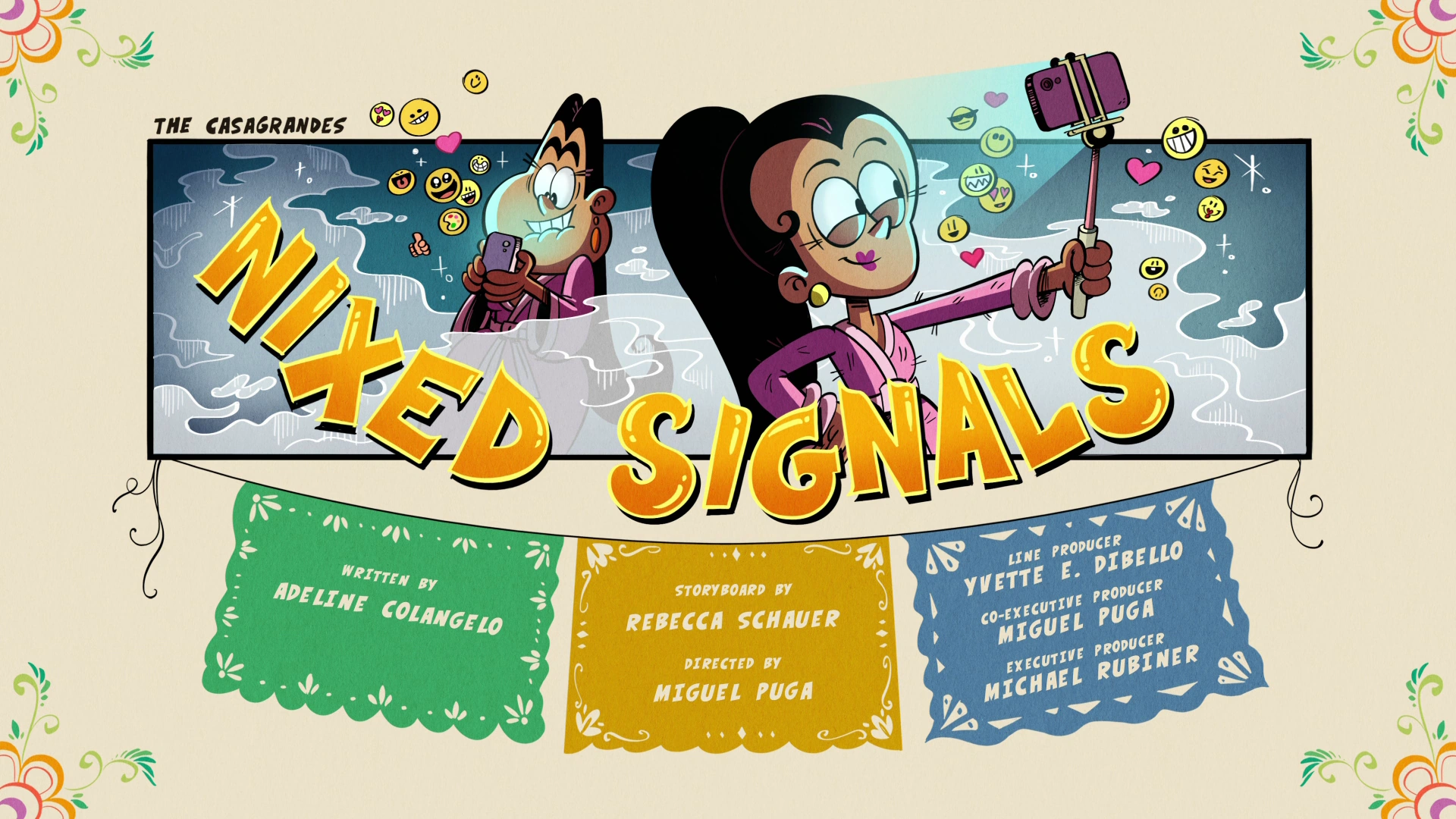"Nixed Signals" is the twenty-second episode of the third season, and the ninety-seventh episode of The Casagrandes. Plot[]Frida asks Carlota to spend a spa day with her to enjoy quality time, but can they both stay off their phones? Synopsis[]Carlota is recording a vlog about what to wear for her and Frida's mother and daughter day, but Carl interrupts the vlog by showing his butt to the camera. As Carlos is putting food on the table, Frida comes in and shows Carlos the sweater she's wearing, which has an image of Carlota as a baby. Carlota comes in and tells Frida that she's ready to go. Frida asks Carlos if he will be okay watching over the boys, to which Carlos tells her that he'll be fine, only to get covered in fake lava from Carl's volcano and stepped on by Lalo. Carlos goes to the window and tells the two girls to be back by 3:00. Frida takes Carlota to the Art Space Gallery to show a sneak peek of her exhibit for the show, Romeo tells Frida he wants to take pictures of her art for her show but can't decide which one. Carlota decides to do vlog to show hew followers a sneak peek of Frida's artwork. There next stop is at Goddess Greens to have lunch, Frida asks Carlota what should they order but Carlota does a another vlog to ask her followers to vote on what they should eat. After their food arrives, Frida was about to take bite but Carlota takes the Aphrodite wrap so she can take pictures of it. At Margarita's Beauty, Carlota is getting a new hairstyle, once Margarita is done Carlota starts taking pictures. Frida tells Margarita she wants her usual trim but Carlota ask her followers that hairstyle Frida should get, they voted for bangs. Once outside of Margarita's, Carlota tells Frida that she looks like a supermodel with the bangs and wants to take a picture but Frida doesn't her to take a picture and tried to take Carlota's phone but falls in to a trash can. Frida tells Carlota the she doesn't want to share what little time they have together with her followers. Carlota apologize and give her phone of Frida. Later the two girls are at Ah, That Feels Good Spa, Frida hears a phone buzzing thinking it's Carlota's phone but it's hers. Frida sees that Romeo wants her to call her so she elects to call him in a locker. Romeo tells Frida her exhibit has gone viral and wants her to respond to fans. Frida tells him it isn't a good day for her but Romeo states that she must seize the opportunity. The two girls are relaxing in the steam room when Frida's phone buzzes, she decided to turn up the steam in the room causing Carlota not being able to see so she can respond to her fans. The second they exit the steam room, Frida's phones buzzes again with more messages so she elects them to get massages. Frida puts Carlota on the massage bed and tells the Hostess to giver her a deluxe massage. While the Carlota is getting a massage, Frida is once again responding her fans. Later the two are taking a mud bath and again Frida phones buzzes so she splashes mud and places hot rocks onto Carlota's face. She sees that Romeo wants her to call him again, Frida then makes a mud figure that looks like her. Frida call ups Romeo and he tells her Jim Sparkletooth wants to livestream interview with her. Carlota still in the mud bath talking about why she broke up with her boyfriend she takes off the rocks from her eyes and sees that "Frida" is crying and she hugs "Frida" but the mud figure falls over. Carlota then hears laughter coming from the changing room, she enter the room to see Frida on her phone doing her interview. Frida explains that she was using her phone for her art and important to respond to her fans. Carlota then states that she uses her phone for vlogging and it's important to her. Frida realize that Carlota uses vlogging to express herself and social media is her paintbrush. Frida offers to give Carlota's phone back but she doesn't want it since it was nice to disconnect from it and wish they had to time for a do-over, then Frida comes up with an idea. At the Casagrande apartment, Carl and CJ use the water from the toilet as a waterslide, they see "Frida" and "Carlota" are home and will clean up the mess but it's just mud figure of the two them. Carlos comes out of the bathroom but slips on the water and crashed into the mud figures of Frida and Carlota thinking he'd "killed them", but instead Frida and Carlota are relaxing in a pool on the roof. Cast[]
