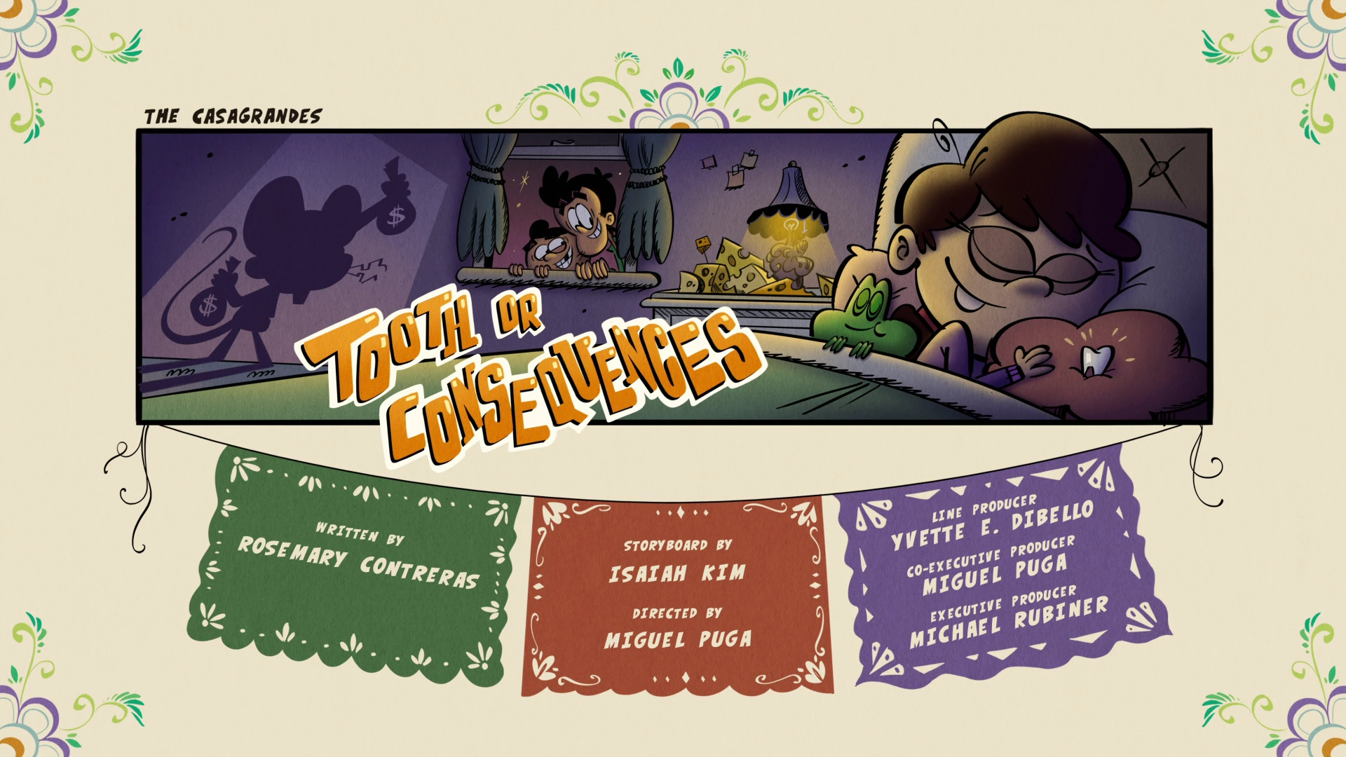 "Tooth or Consequences" is the thirty-fourth episode of the second season, and the seventy-second episode of The Casagrandes. Plot[]When Adelaide loses a tooth, Carl and Bobby teach her about El Raton, the Latin American "tooth fairy." Synopsis[]Carl and Adelaide are playing on the apartment rooftop. When the two try to catch Froggy 2 after he steals their bag of cookies, the two end up hitting each other hard enough for Adelaide's wiggly tooth to finally come out. This makes Carl tell her the story of El Raton, the Mexican/Latin American rendition of the Tooth Fairy, who is a mouse that travels from country to country to exchange teeth for money. When night comes, Adelaide and Froggy 2 attempt to make El Raton's visit to her apartment worthwhile, so they offer a few cheese-based snacks to give while she places her tooth under her pillow, and immediately falls asleep. The next day, Adelaide angrily barges into the Casagrande apartment to tell Carl that El Raton didn't come and accuses him of fabricating the story. Carl tells her that El Raton is never a no-show, and asks Bobby if he saw any mice the day before. Bobby attempts to flee, but after being stopped by Carl, Bobby reveals that he might have drove El Raton away, saying that he saw a mouse stealing chicharrones, and chased it out of the store, telling it to never come back. Realizing he drove away their tooth fairy, the three attempt to find a way to get El Raton to come back to Great Lakes City. Bobby first suggests dressing up like a big block of cheese (since mice love cheese), but is attacked by Vito and his dogs after the former says that he had a dream where he was eaten by a big block of cheese. Carl suggests lowering the tooth into the sewer to attract El Raton, but they end up catching an crocodile, who initially uses the tooth top fill in an empty spot in his upper jaw (which Adelaide takes back). Adelaide suggests that, like the story of Cinderella, they have a bunch of mice try on a plastic doll shoe where, if the shoe fits, they would be be able to identify El Raton. Baiting the mice by giving them a 30 second shopping spree, the three attempt to see if any mice can fit the plastic shoe, but none of the mice fit, and by the end, the mercado is completely empty. Adelaide, eventually runs away crying, believing that El Raton will never come, and Carl and Bobby, not wanting to see Adelaide sad, decide to take matters into their own hands. Carl reveals that he bought a mouse from Pete's pet shop who is supposedly the smartest mouse there is. In an attempt to get Smart Mouse to fit the role of El Raton, Carl and Bobby train him to be a good climber and be sneaky enough to take teeth without waking the one who's sleeping. Once they're done training him, Carl tells Smart Mouse, now wearing El Raton's clothes, to put the cash under Adelaide's pillow. The next day, Adelaide once again barges angrily into the Casagrande apartment to tell Bobby and Carl that El Raton still failed to show up. When the two question what could've happened, Bobby gets a text from Smart Mouse revealing that he used the money to buy himself a flight to Switzerland to go on a cheese tour. While Carl is mad that Smart Mouse played them, Bobby, knowing that he's responsible for El Raton's disappearance (and that he'll crush the hopes and dreams of all the other kids who have lost teeth), decides that there's only one thing left to do. Bobby's plan is that he he'll take on the role of El Raton himself. After climbing up to Adelaide's room, he is suddenly attacked by Adelaide's array of pets. While trying to gets the animals off, Bobby discovers the real El Raton arrive, and in his shock, falls out the window and lands in a trash can. The next day, Carl and Adelaide wake Bobby up to tell him that El Raton finally arrived and has given Adelaide and all the other kids who have lost teeth bags of money. Adelaide also reveals that El Raton gave her an apology note, saying that the reason why he was so late was because he was attending a family reunion in Chile. As Bobby smiles, knowing that he wasn't responsible for driving El Raton away, he suddenly loses a tooth, making him remark that El Raton will be coming back tonight. Cast[]