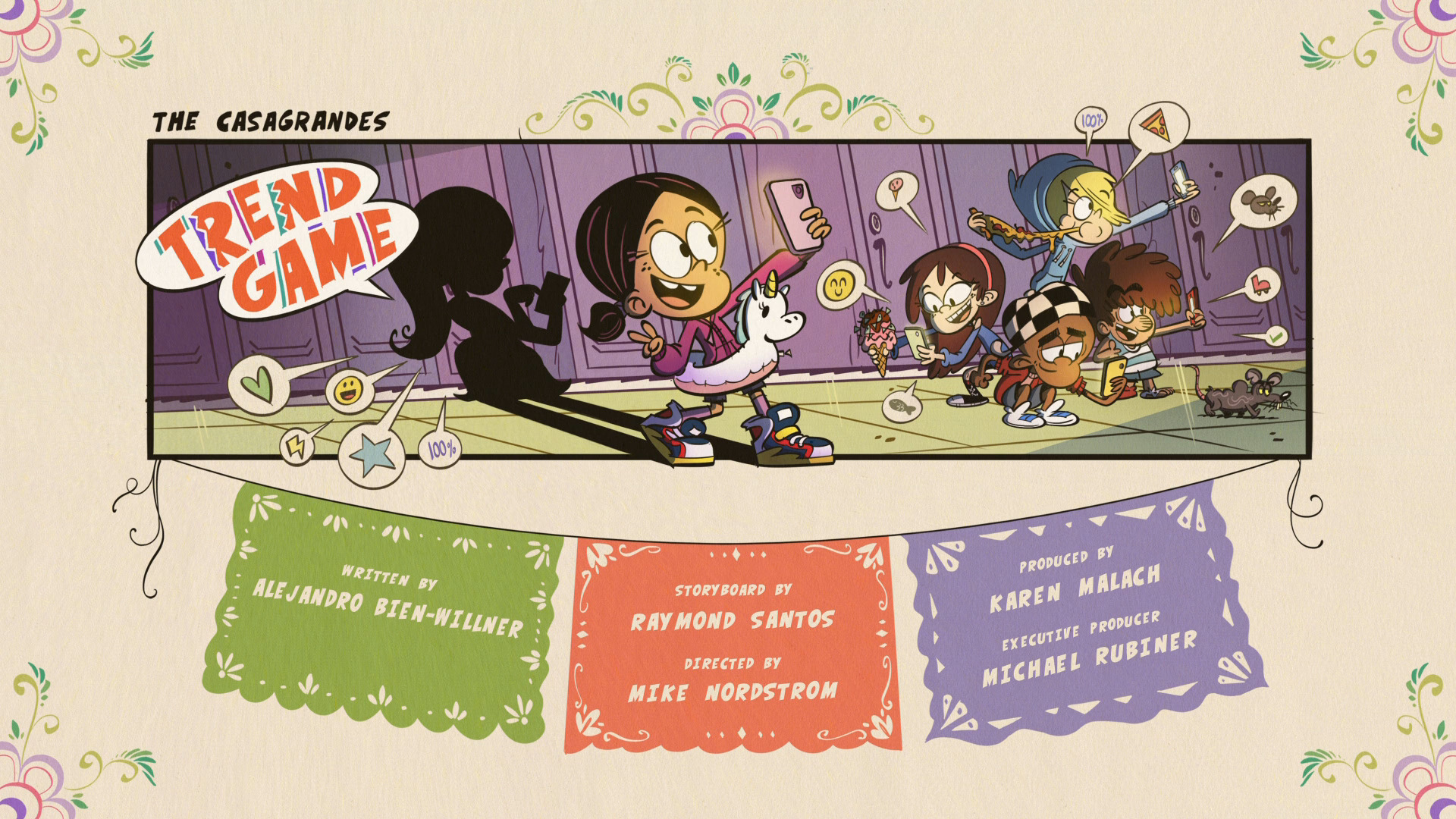 "Trend Game" is the eighteenth episode of the first season of The Casagrandes. Plot[]When Ronnie Anne realizes that she's not up to date on all of the latest trends, she seeks help from Carlota. Synopsis[]At Chavez Academy, Ronnie Anne discovers Sid, Casey, Sameer and Nikki are discussing about the latest trends that have been happening. Ronnie Anne tries to join in on the discussion about the trends she heard of, but her friends tell her that what she's seen is already outdated. Back at home, Ronnie Anne discovers that her family too is on the trends, and they give her some ideas on which one she should get into. At that moment, Carlota arrives and Ronnie Anne discovers that she's up to speed on everything, so she asks for her advice, and Carlota gladly accepts. Carlota tells Ronnie Anne about the latest trends. Throughout the whole day, Carlota takes Ronnie Anne around the city while partaking in many activities, like wearing churros as bracelets, doing a 5K marathon wearing pool floaties, buying new shoes at the hair salon and riding in a subway train that has pop-up parties. The next day, Ronnie Anne recounts her adventure to her friends, and are impressed at the amount of activities she did. They ask if they can hang out on the weekend, but Ronnie Anne excuses herself. The next day, Ronnie Anne wakes up and discovers Sid, Casey, Sameer and Nikki are present. They state that they want to hang out with her because of all the things she did two days ago. Ronnie Anne attempts to ask Carlota for some help, but she's too busy at the moment. This forces Ronnie Anne to improvise the whole day, such as squatting to walk and eating ice cream with syrup and sardines. When Ronnie Anne attempts to get help from Carlota again, she gets a notification that there's a party being held in an abandoned subway tunnel. Ronnie Anne tells this news to her friends and they immediately start heading there. Ronnie Anne realizes that her friends just want to spend time with her. As the five friends arrive to the intended subway tunnel, Carlota gets a text from Ronnie Anne thanking her for the reminder. Carlota, however, reveals that didn't mean to say "abandoned subway tunnel", but instead "band in South Bay Tower", which was a typo. As the five walk through the tunnel, they discover something in the distance. Shining their phone lights, they discover a giant pack of rats approaching and quickly attempt to escape. However, the five are too slow to escape in time and get swallowed up by the pack of rats, who fling them out of the tunnel. Ronnie Anne apologizes, saying that Carlota is the reason why she's up to speed on the trends, but her friends state that all they wanted was to spend time with her, no matter if she was up to speed. The next day, Ronnie Anne and her friends discover that many of the students at school are squat walking, making them comment that Ronnie Anne really did start something new. Cast[]