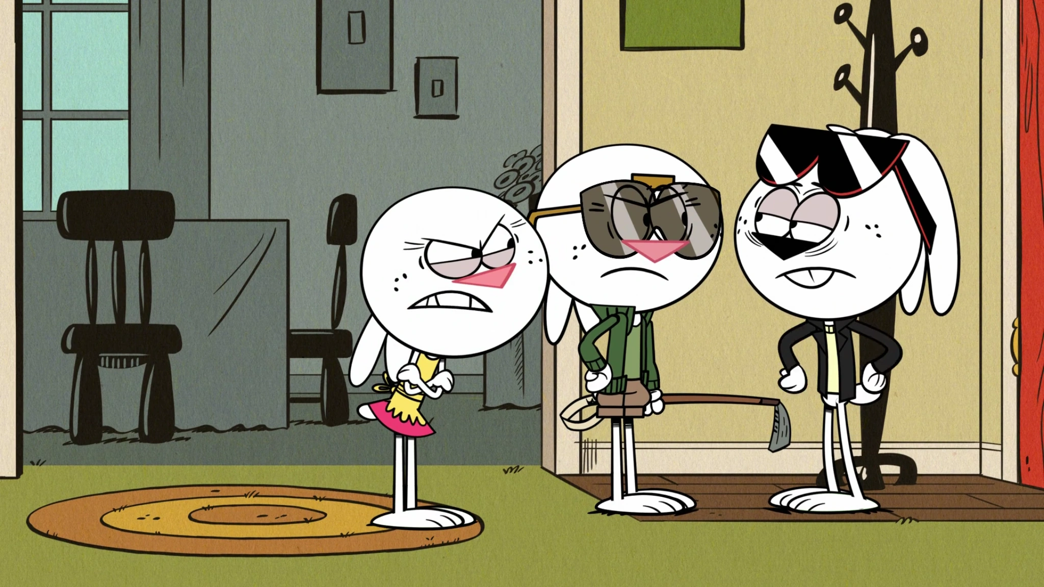 "White Hare" (originally titled "Hide nor Hare") is the second episode of the third season and one-hundred-third episode of The Loud House. Plot[]Lincoln has a plan for introducing himself to a new girl. Synopsis[]Lincoln is planning on meeting a new girl in town, and wants to make a good first impression. Donning a leather jacket, some slick shades, a temporary tattoo, and a book featuring slang, Lincoln is prepared to leave, but his sisters catch him trying to sneak out. Lincoln tries to convince them that he has nothing to hide, but Clyde calls him up, and unknowingly reveals that Lincoln is planning on introducing himself to a new girl. The sisters offer to help, but Lincoln, remembering the last time his sisters meddled with his private business,[1] refuses, and runs away from the house. In the woods, Lincoln decides to hide until the bus arrives. As he relaxes, he discovers a male rabbit hopping by, and being crowded by his 25 sisters. When Lincoln imagines how difficult it is to live with 15 extra sisters, he gets startled, and hits his head on a tree branch, causing him to fall unconscious and start dreaming. Lincoln, now a rabbit named Warren, tries to leave the house, but gets caught by his 25 sisters. Warren tries to convince them that he has nothing to hide, but his friend, a beaver named Danny, unknowingly reveals Warren's plans, and the sisters eventually begin to meddle. Not wanting to be interfered, Warren attempts to run away, but just before Warren can escape, he is caught and the sisters eventually strip Warren of all his wardrobe, and make him wear a simple lavender polo shirt, as well as give off some advice they consider useful, and an assortment of items, such as a bunch of books, a kelp smoothie, allergy test pads, and a lucky rabbit's foot (much to everyone's disgust). Upon leaving, Warren encounters the new girl, and attempts to give off a first good impression using his sister's advice, but only ends up making the new girl more uncomfortable and irritated, since Warren would constantly flub up his attempts to make a good impression. Eventually, a rabbit donning a leather jacket and some slick shades arrives, and successfully impresses the new girl with his leather jacket. Realizing he blew his chance, Warren sadly sits on a tree stump in defeat, and Danny meets up with him. As Danny remarks that Warren has to wait for a new girl to arrive in town before he can make another good impression, Warren frustratingly admits that his sisters always meddle with his business. After tossing the rabbit's foot he was given, Warren suddenly falls over, and begins hallucinating once more. The real you is the perfect you. Lincoln finally wakes back up, and discovers the male rabbit being smothered by his sisters. When Lincoln realizes that the rabbit got to make a good impression with a female rabbit, Lincoln realizes that his sisters might have had some helpful advice. With five minutes left before the bus arrives, Lincoln quickly rushes back home, and begs for his sisters' help. After a hefty amount of effort in getting Lincoln to stop talking, the sisters reveal that they want Lincoln to just be himself, since him being himself is what already makes him likable. Upon being turned back into his normal self, Lincoln barely manages to catch up to the bus. Upon boarding, Lincoln discovers that the new girl is by herself, and offers to sit next to her. By being himself, Lincoln successfully manages to make a good impression, as he and the new girl laugh as they head off to school. Cast[]